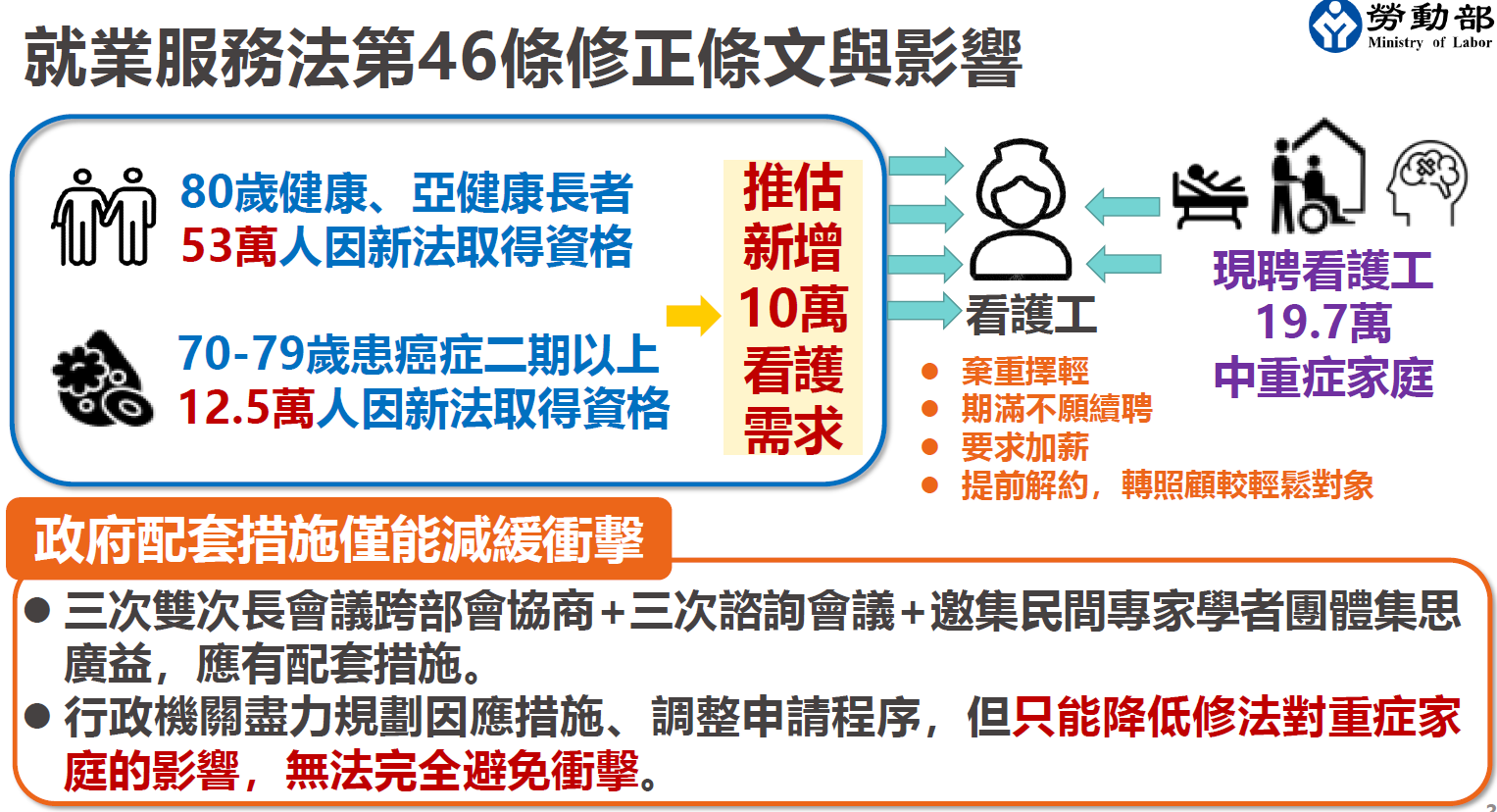 新增開放被看護者年齡滿 80 歲以上或 70 歲至 79 歲患有癌症二期以上者,得免經醫療機構之專業評估,聘僱外籍家庭 看護工。相關子法將於 8 月 1 日上路,估計將增加 10 萬健康、亞健康長者申請, 恐衝擊重症家庭更難找人或留人。為盡力降低修法對重症家庭的衝擊,勞動部 推動六大配套措施,保障重症家庭聘僱移工權益。
