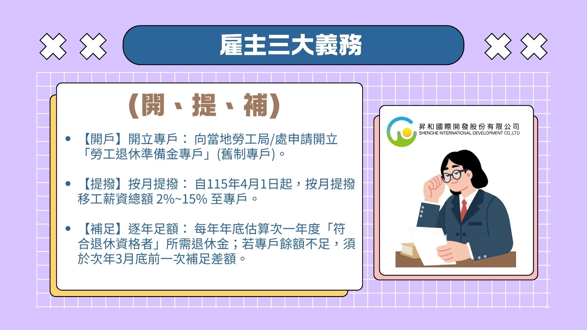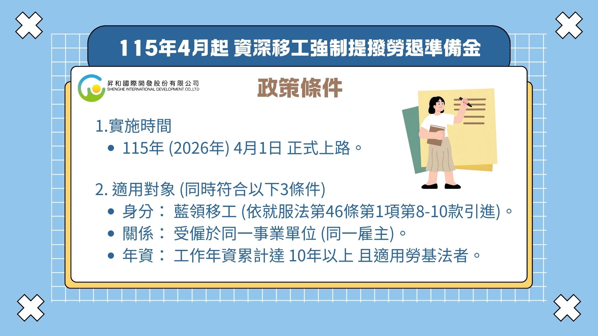 隨著「移工留才久用方案」推動,外籍移工在台工作年限放寬,退休權益備受關注。勞動部勞動力發展署已正式公告,自 民國115年(2026年)4月1日 起,雇主若聘僱受僱於同一事業單位、年資達10年以上且適用勞動基準法之移工,必須依法開立勞工退休準備金專戶(舊制勞退),並按月提撥退休準備金,以保障資深移工的退休權益。