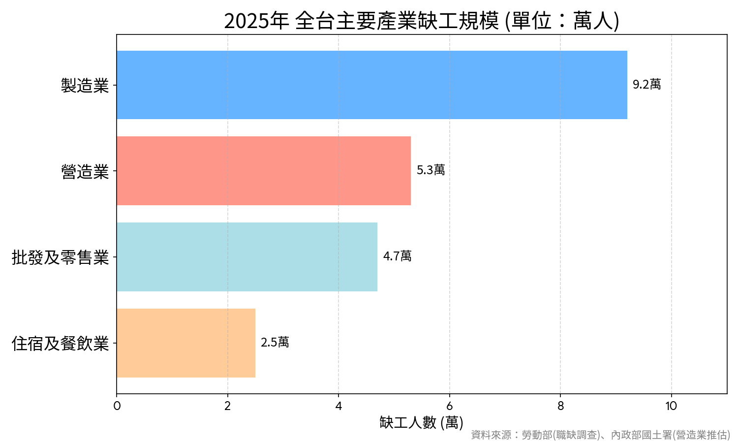 1.製造業(職缺約 9.2 萬人): 雖訂單回穩,但基層技術工與操作工長期短缺。平均招募時間拉長至 3.5 個月,嚴重影響產線產能。