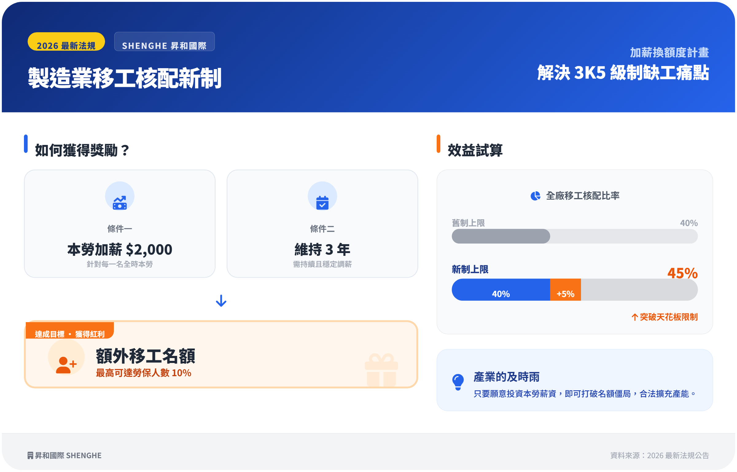 根據 2026 年最新法規,製造業雇主若為每一名全時本國勞工加薪 NT$2,000(且需維持 3 年),即可額外申請 1 名移工名額,總額外名額最高可達勞保投保人數的 10%,使全廠移工核配比率上限從 40% 提升至 45%。這對於訂單穩定但苦於 3K5 級制名額限制的工廠來說,無疑是及時雨。