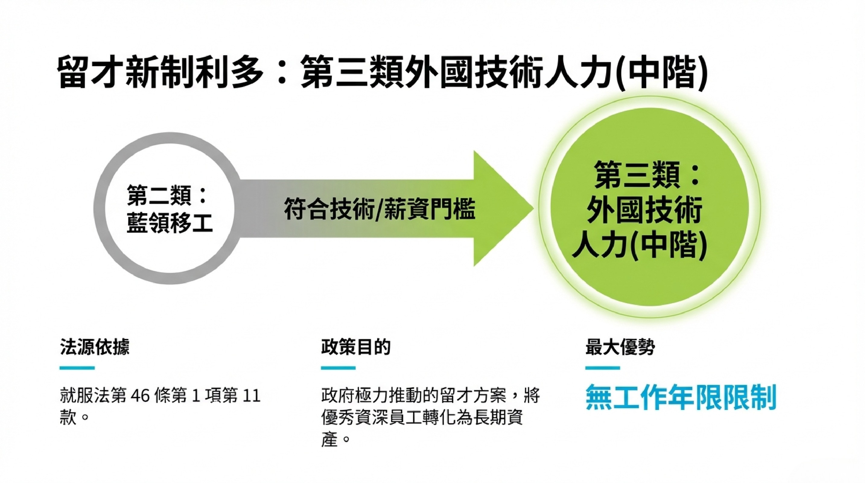 一、全方位技術留才: 一站式辦理資深移工轉任外國技術(中階)人才手續。