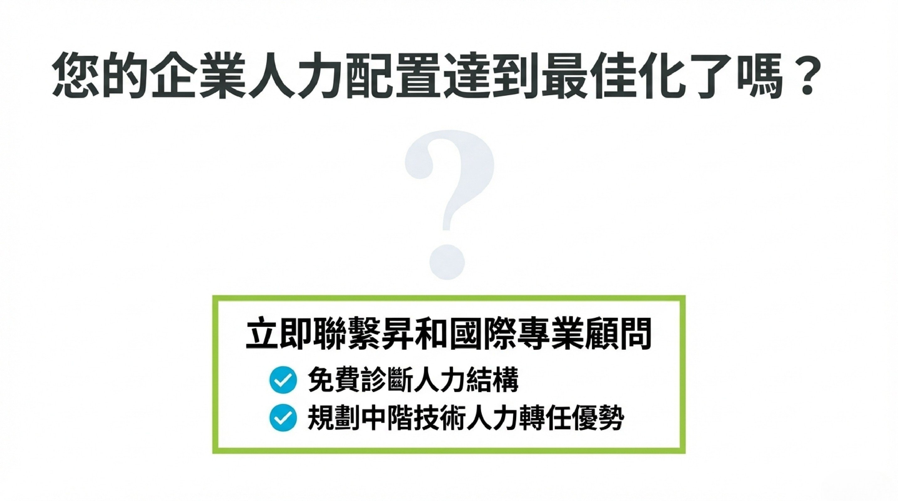 您的企業人力配置達到最佳化了嗎?現在正是調整戰略的最佳時機。昇和國際專業顧問提供「免費診斷人力結構」服務,助您掌握外國技術人力轉任優勢。