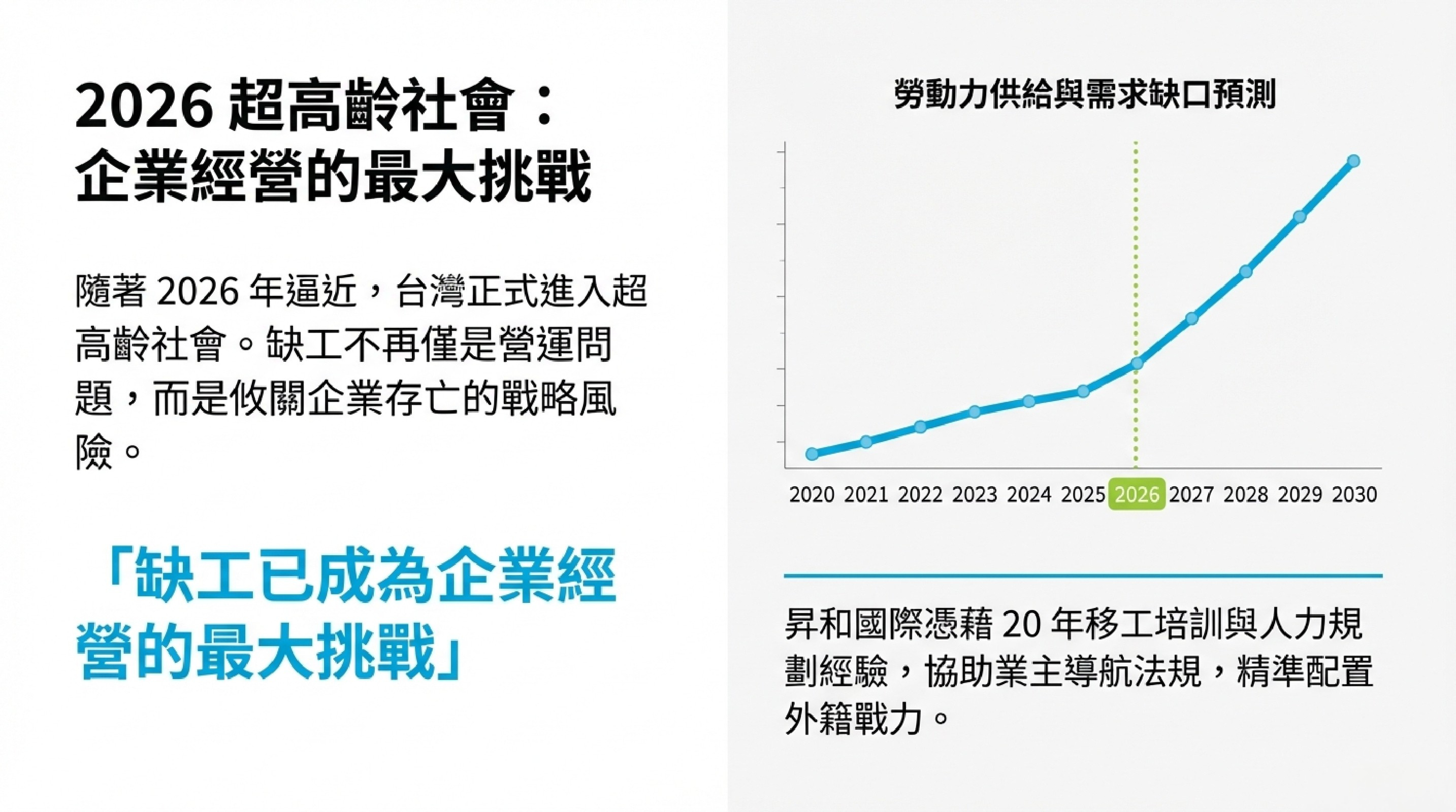 根據數據預測,2026 年起台灣勞動力供給與需求缺口將持續擴大。昇和國際指出,缺工不再只是營運問題,而是攸關企業存亡的戰略風險。