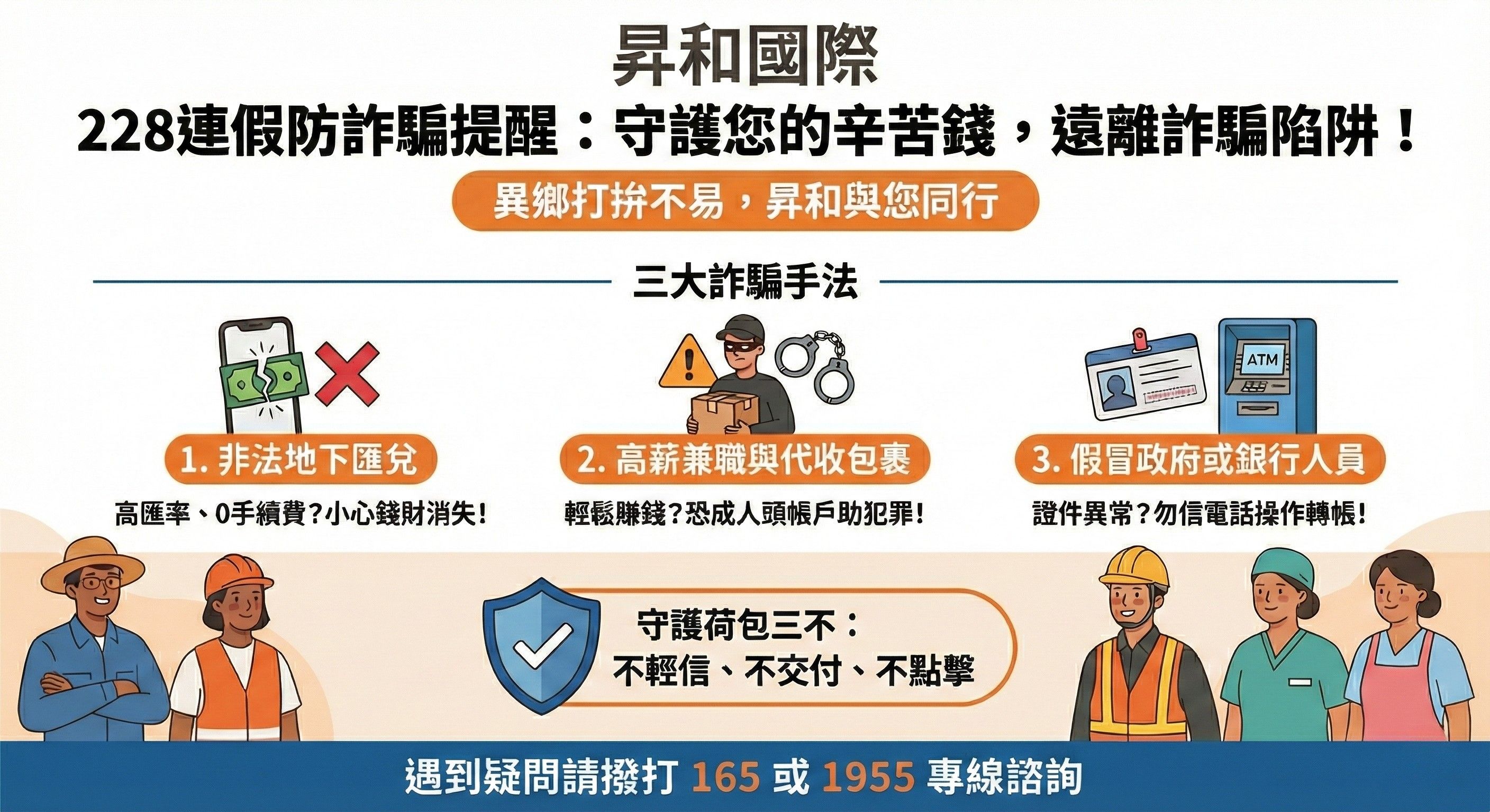 各位雇主與移工朋友平安!今天是農曆年後的開工首日,昇和國際在此祝賀大家工作順利、萬事如意。緊接著本週末即將迎來 228 和平紀念日三天連假,在安排旅遊與聚會之餘,我們特別提醒大家注意連假期間的財物安全,避免落入詐騙集團的圈套。